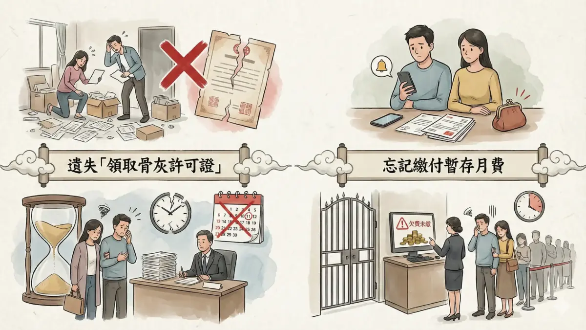 💰 2. 忘記繳付暫存月費: 若暫存超過免費期,請務必按時繳費並保留暫存費收據。雖然政府不會隨意棄置骨灰,但積欠費用會導致領取骨灰程序卡關,可能需要先補繳欠費方可繼續辦理領取手續,增加當日等候時間及壓力。