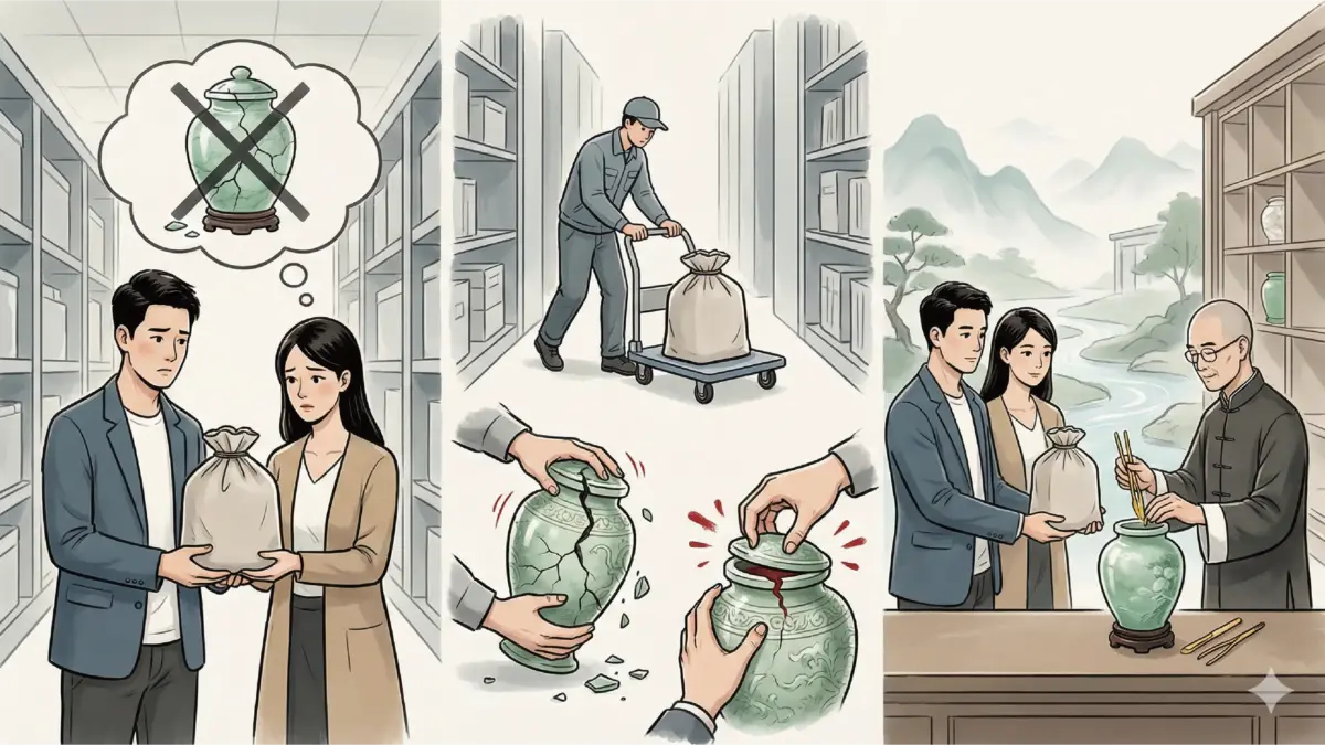 許多家屬會急著購買昂貴的玉石或雲石骨灰盅去盛載。然而,在暫存階段,不建議過早將骨灰轉移至易碎的永久骨灰盅內,原因如下: