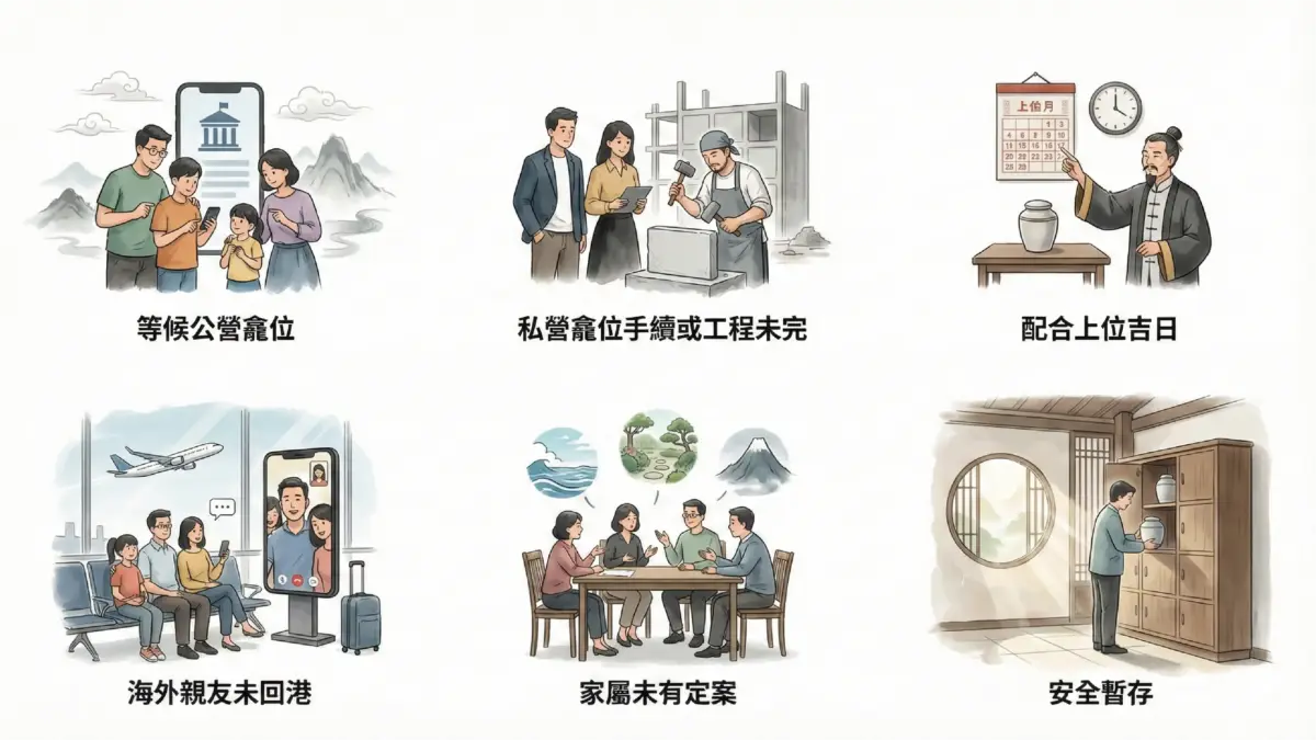 • 家屬未有定案:尚未決定長遠安置方式(如海葬或花園葬),先行暫存較穩妥。