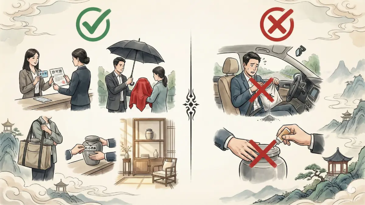 - 帶備紅布/黑傘: 依照傳統習俗,骨灰不見天日。出入室外時需遮擋。