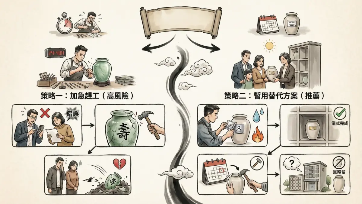 ⚡️ 有時火化期或上位吉日迫在眉睫,等不及標準刻字時間(急用骨灰盅刻字)。這時家屬面臨兩個選擇,各有風險: