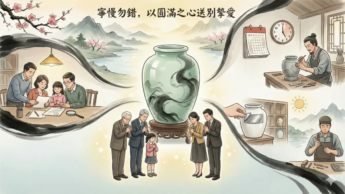 操作(推薦): 先購買「淨盅」(無字骨灰盅),用專業金屬貼紙或防水相紙暫時將先人資料貼在盅上,先完成上位儀式。待日後時間充裕,再擇日進行正式雕刻。