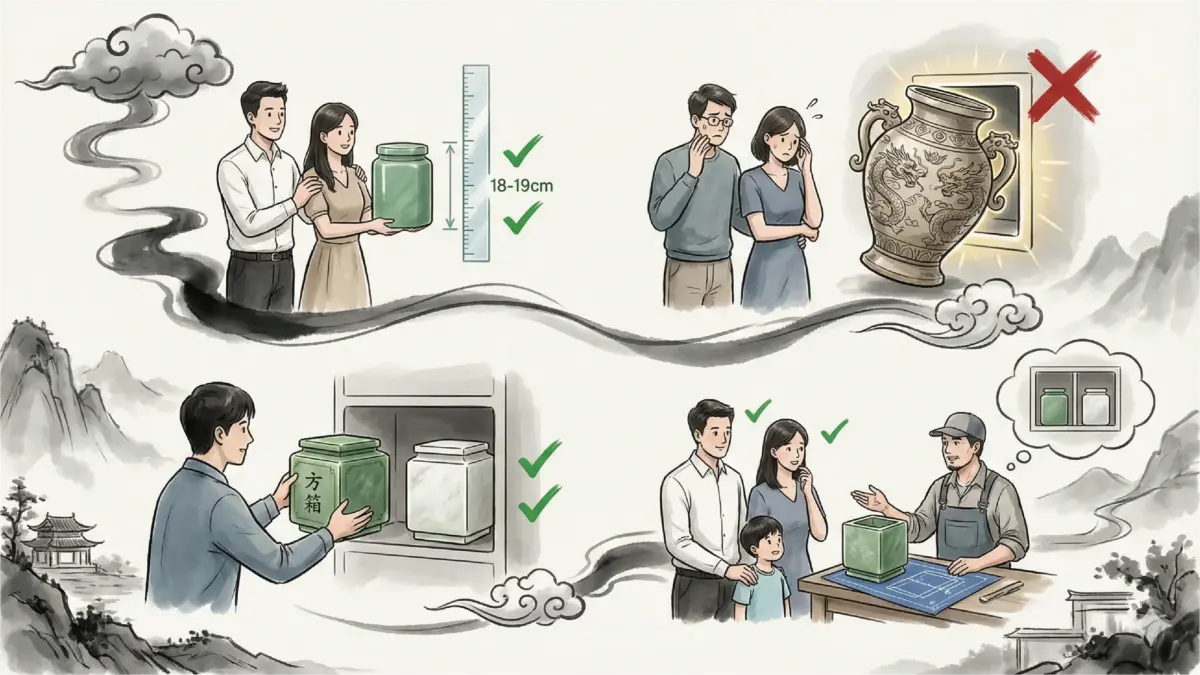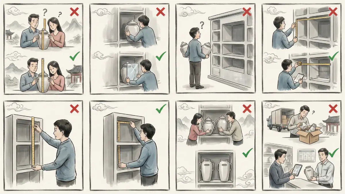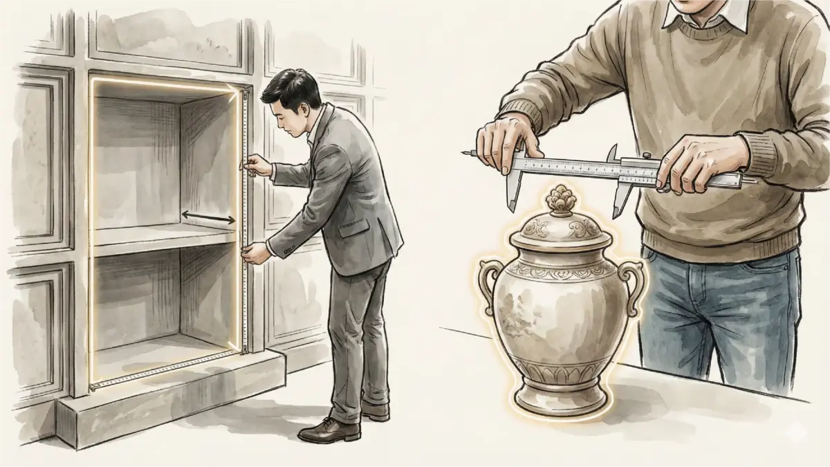 骨灰盅的「最大外部尺寸」(連蓋、連耳),必須小於龕位的「最小內部尺寸」。建議上下左右預留最少 1-2cm 的緩衝空間,以便手指有空間伸進去擺放,避免買錯骨灰盅尺寸。